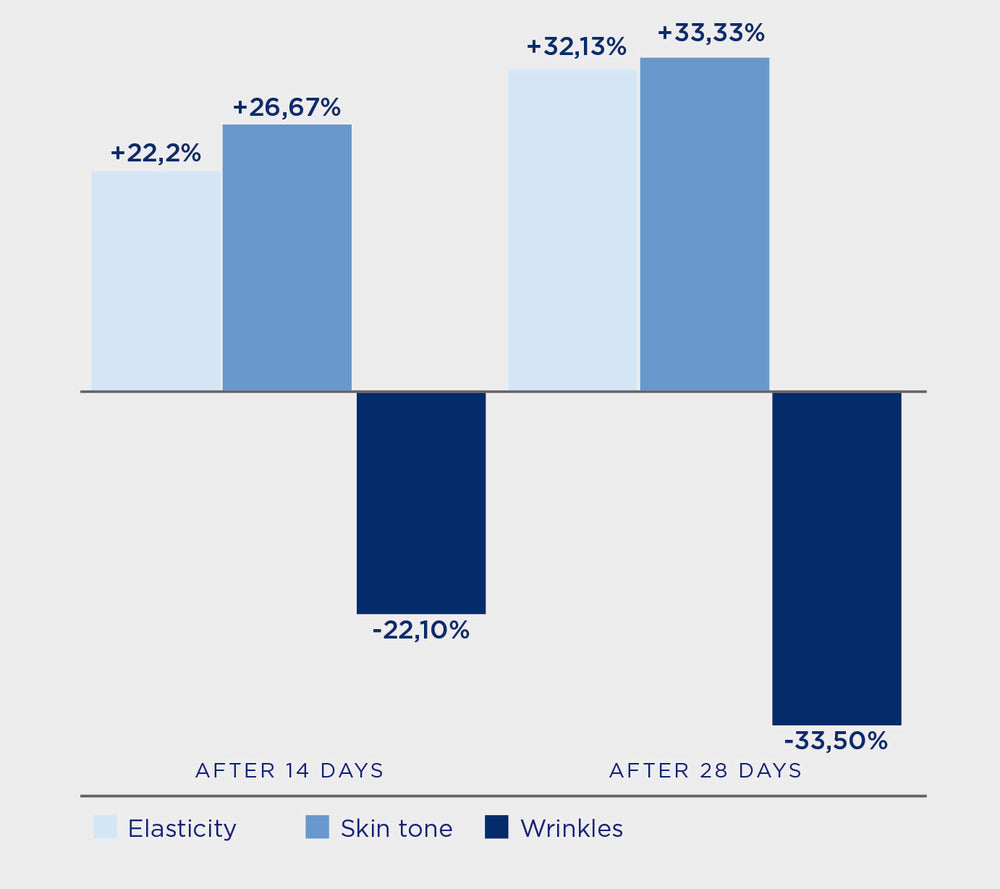 • Reduces the appearance of wrinkles and loss of elasticity.